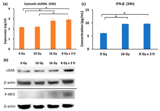 The expression level of cGAS showed the maximum expression level at 8 Gy × 3 fr. The average area density values normalized to a loading control (β-actin) in three independent experiments were 0.527 ± 0.168, 0.716 ± 0.207, 0.670 ± 0.181, and 1.283 ± 0.553, at 0 Gy, 10 Gy, 16 Gy, and 8 Gy × 3 fr, respectively. The expression level of phosphorylated-IRF3 (p-IRF3), which plays an important role in the intracellular signal transduction cascade, increased in a dose-dependent manner, but only a slight difference was observed between the IFN-β concentration in the cell lysates 24 h after the last irradiation increased at 16 Gy and 8 Gy × 3 fr compared with 0 Gy (Figure 3c).
