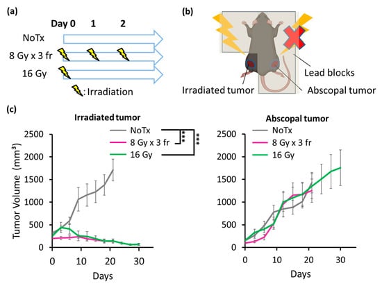 Tumor volume changes by radiation monotherapy. (a) The treatment schedule. Treatments were initiated when the longest diameter of the tumor exceeded 8 mm (day 0). (b) The irradiation setup. (c) The tumor volume changes in irradiated and abscopal tumors. Each error bar represents SE. Tukey–Kramer’s HSD test was performed to compare the differences in tumor volumes on day 18 between NoTx (N = 12), 8 Gy × 3 fr (N = 11), and 16 Gy (N = 7) groups. Tumor volume was evaluated until 70% of the mice in each group were dead. ***: p < 0.001. Abbreviations—NoTx: no treatment; fr: fraction.