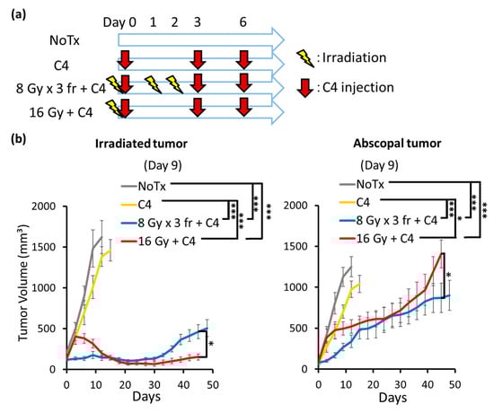 Interestingly, the significant abscopal tumor volume reduction was obtained by the combination therapy of both radiation delivery regimens. Of note, the local and abscopal responses in the 8 Gy × 3 fr + C4 group were initiated earlier than that of the 16 Gy + C4 group. A similar abscopal response was observed until day 40 in both groups; however, rapid tumor regrowth was observed in the 16 Gy + C4 group (p < 0.05) (Figure 5b).
