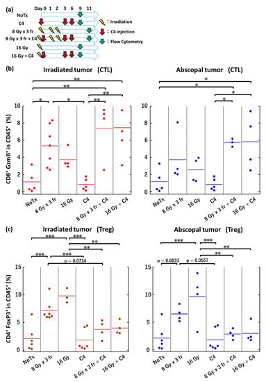 The mice were sacrificed 9 days after the initial treatment to analyze the tumor immune microenvironments. Tumor samples were collected from the mice in the following groups: NoTx, C4, 8 Gy × 3 fr, 8 Gy × 3 fr + C4, 16 Gy, and 16 Gy + C4. For the CTL infiltration analysis in the irradiated tumors, the number of mice was 5, 5, 7, 4, and 5 in NoTx, C4, 8 Gy × 3 fr, 8 Gy × 3 fr + C4, 16 Gy, and 16 Gy + C4 groups, respectively. The corresponding number of mice in abscopal tumors was 5, 5, 4, 3, 4, and 4, respectively. For the Treg infiltration analysis in the irradiated tumors, the number of animals was 6, 6, 7, 4, 3, and 4 in NoTx, C4, 8 Gy × 3 fr, 8 Gy × 3 fr + C4, 16 Gy, and 16 Gy + C4 groups, respectively. The corresponding number of mice in the abscopal tumors was 6, 6, 4, 4, 4, and 4, respectively.