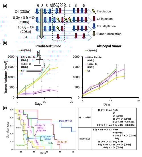 The CD8 depletion experiment was performed in the following groups: (1) a group treated with C4 (N = 14), (2) a group treated with C4 with an anti-mouse CD8α antibody (C4 (CD8α); N = 8), (3) a group treated with 8 Gy × 3 fr + C4 with an anti-mouse CD8α antibody (8 Gy × 3 fr + C4 (CD8α); N = 8), and (4) a group treated with 16 Gy + C4 with an anti-mouse CD8α antibody (16 Gy + C4 (CD8α); N = 8). An anti-mouse CD8α antibody (InVivoMAb; clone: 2.43, BioCell, Lebanon, NH, USA) at 120 μg was administered via i.p. every 3 days starting at 9 days before tumor inoculation, based on a previous publication [,]. Treatment was initiated when the longest tumor diameter exceeded 8 mm (day 0). C4 was injected three times every 3 days.
