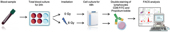 - Vogin, G.; Merlin, J.-L.; Rousseau, A.; Peiffert, D.; Harlé, A.; Husson, M.; El Hajj, L.; Levitchi, M.; Simon, T.; Simon, J.-M. Absence of correlation between radiation-induced CD8 T-lymphocyte apoptosis and sequelae in patients with prostate cancer accidentally overexposed to radiation. Oncotarget 2018, 9, 32680–32689. [Google Scholar] [CrossRef] [PubMed][Green Version]