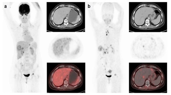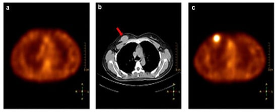FAP is overexpressed in cancer-associated fibroblasts in the tumor stroma of several types of cancers, including breast, colon, and pancreatic carcinomas. FAP plays a role in tumor invasion and metastasis []. The FAP inhibitor (FAPi) is currently being tested as a cancer therapeutic in clinical trials. Radiopharmaceuticals, such as [68Ga]Ga-FAPI-2 and [68Ga]Ga-FAPI-04, based on FAPi were found to be highly promising as molecular imaging probes []. [68Ga]Ga-FAPI-04-PET/CT and [18F]FDG-PET/CT were compared in 20 female breast cancer patients with primary and recurrent breast cancer in a prospective study []. PET/CT imaging with [18F]FDG and [68Ga]Ga-FAPI-04 were performed in the same week. In detecting primary breast lesions, [68Ga]Ga-FAPI-04 had a higher sensitivity than [18F]FDG (100% vs. 78.2%). PET/CT imaging with [68Ga]Ga-FAPI-04 also showed a significantly higher T/B ratio in breast lesions and in hepatic, bone, brain, and lung metastases (p < 0.05) (Figure 3). Thus, [68Ga]Ga-FAPI-04-PET may offer an advantage over [18F]FDG in delineating tumors to improve diagnosis and help guide FAPi therapy. Kömek et al. suggested that [68Ga]Ga-FAPI-04-PET has an advantage in detecting both primary and metastatic tumors because of its high sensitivity, high SUVmax, and high T/B ratio. Limitations to this trial included the presence of latent bias due to the lack of histological verification on biopsied tissues. Kratochwil et al. found that these tracers could be useful beyond breast cancer []. FAP-targeted PET radiotracers are now considered as potential alternatives to [18F]FDG-PET [,].
