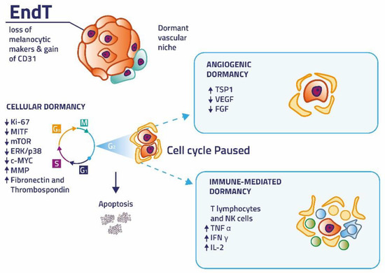 The intricate combination of events enables these cells to release specific factors that restrain their growth-signaling pathways and help them escape immune surveillance and chemotherapy. Dormant melanoma cells act together by controlling the immune regulation, causing impaired angiogenesis, and arresting the cell cycle [26,27]. Clinically, tumor dormancy depends on at least three elements. The first is called cellular dormancy, in which single tumor cells persist in a quiescent, slowly dividing state (with a low expression of Ki-67). The second is called angiogenic dormancy, in which lack of vascularization holds the growth of micrometastasis in check and promotes apoptosis. The final element is immune-mediated dormancy, where the immune system continues to limit the tumor population [4]. Then, specific and as yet unknown processes, may awake dormant micrometastasis and these cells become active again. Once activated, tumor cells expand, proliferate and form metastasis at a distant site from the primary tumor, leading to patient morbidity and mortality [28]. A possible prevalence of apoptotic phenomena on proliferation, or a strong anti-tumor immune response associated with deficient stromal receptivity, including any angiogenesis defects, mediate tumor regression [11]. Revealing the main factors contributing to the process of tumor dormancy will help identify new genetic targets to be used in the clinic as therapeutical approaches to stop the progression of melanoma (Figure 1).