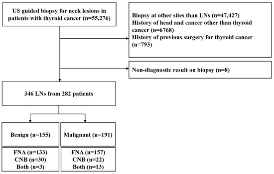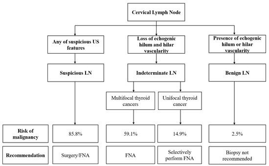 - Chung, S.R.; Baek, J.H.; Choi, Y.J.; Sung, T.-Y.; Song, D.E.; Kim, T.Y.; Lee, J.H. Diagnostic algorithm for metastatic lymph nodes of differentiated thyroid carcinoma. Cancers 2021, 13, 1338. [Google Scholar] [CrossRef]