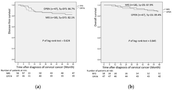 Oncologic outcomes of minimally invasive surgery (MIS) versus open radical hysterectomy: (a) 5-year disease-free survival; (b) 5-year overall survival.