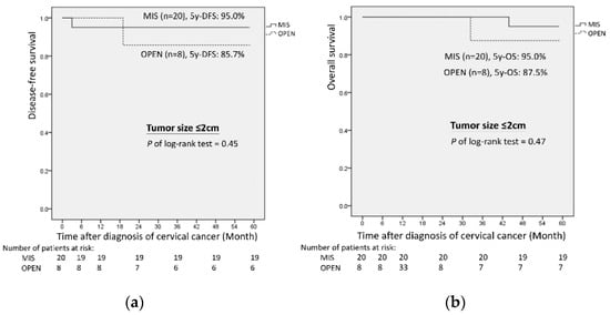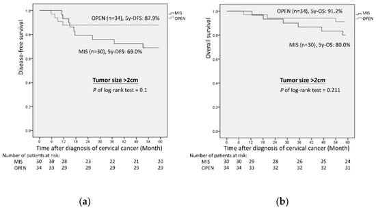 The baseline characteristics revealed that the open group had significantly larger tumor sizes than the MIS group. As such, a selection bias between the two groups may have been present, considering that larger tumor sizes are indicative of more complicated surgical procedures, longer operative time, increased metastatic risk, or require advanced surgical technique during MIS. Therefore, our surgeons tended to perform laparotomy radical hysterectomy in patients with larger tumor sizes. We noted that when the pathologic tumor size was >2 cm, a better OS (87.9% vs. 69.0%) and DFS (91.2% vs. 80.0%) were noted in the open group (Figure 3). This suggests that laparotomy radical hysterectomy might be a better surgical option for patients with tumor sizes > 2 cm. This conclusion is also consistent with the outcomes of the SUCCOR study [].