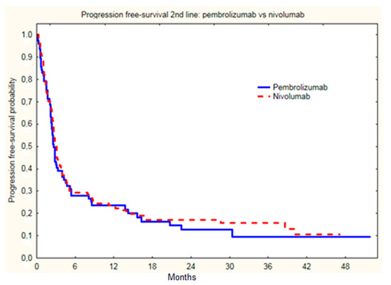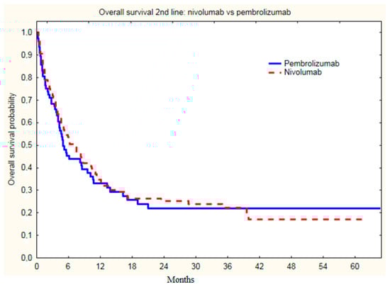 There were no statistically significant differences in ORR between the treatment groups with nivolumab and pembrolizumab (p = 0.90) (Table 2), as well as median PSF (p = 0.54), as PSF on nivolumab was 3.0 months, and on pembrolizumab 2.7 months (Figure 2); and OS on nivolumab was 6.6 months, and on pembrolizumab 5.0 months (Figure 3).