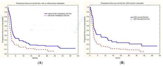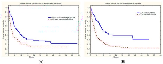 The presence of brain metastases (Figure 5A) and LDH level (Figure 5B) correlated with median OS (p < 0.0001 and p < 0.0001, respectively). Moreover, the presence of liver metastases at the initiation of second line therapy, i.e., immunotherapy, correlated with OS (Table 4).