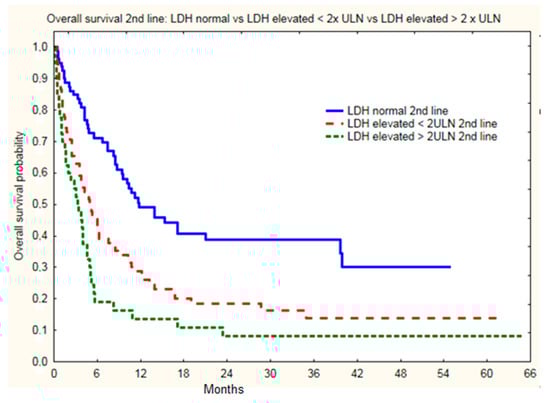 For anti-PD1 treatment, statistically significant differences were found in the OS of subgroups of patients with different LDH levels. The highest survival was observed in patients with normal LDH levels, where 24-month OS was 39% vs. 19% for patients with elevated LDH (<2ULN) vs. 8% for patients with LDH > 2ULN (p < 0.0001) (Figure 6). Other factors that correlated with OS achieved after initiation of second line treatment were presence with brain metastases both at treatment initiation as well as at second line therapy initiation (Table 4). None of the patients without brain and without liver metastases had normal LDH (Table 5). High LDH level also correlated with shorter survival in patients with liver (p = 0.004) metastases and in patients without brain metastases (p = 0.007). The greatest clinical benefit with second line immunotherapy and longest OS was observed in patients with LDH ≤ ULN and without liver or brain metastases at baseline (>2 years). Longer OS was also noted in patients with time to PD >6 months in first line (slow progression).