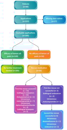 A total of 66 patients received 222 applications of lemon oil pads against nausea and vomiting and were included in the analysis (Figure 1).