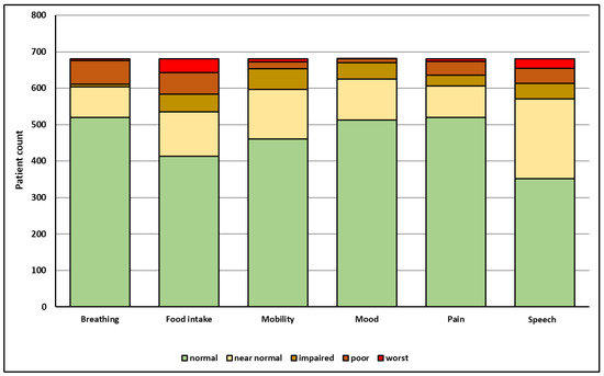 Poorest outcome in at least one of six functional domains (food intake, breathing, speech, pain, mood, and neck and shoulder mobility) in 681 patients with incident HNC. A normal or near-normal outcome in all six functional domains was observed in 61% of HNC-patients; however, 30% had a relevant impairment in at least one functional domain and 9.1% had maximal functional impairment (worst possible outcome) in at least one functional domain.