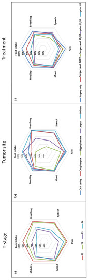 Star plots representing percentage (star axes) of HNC-patients with normal or near-normal functional outcomes (functional integrity) in six functional domains depending on T-stage (a), tumor site (b), and treatment modality (c). The further peripherally, the better (Mobility: neck and shoulder mobility).