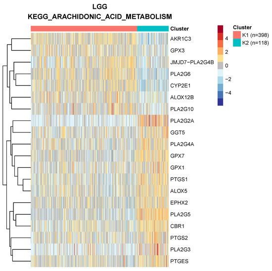 Clustering of low-grade glioma patients using the genes involved in arachidonic metabolism according to KEGG. Only the 20 genes most differentially expressed between the two clusters are shown.