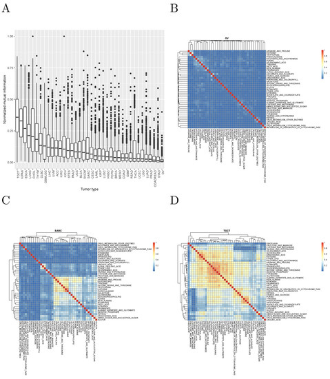 (A): Normalized mutual information between clusterings of samples using KEGG metabolic gene sets (tumor type abbreviations are those used by the TCGA and are explained in Supplementary Table S1). (B–D): Examples of tumor types with low, intermediate, and high normalized mutual information between clusterings obtained with different metabolic pathways.