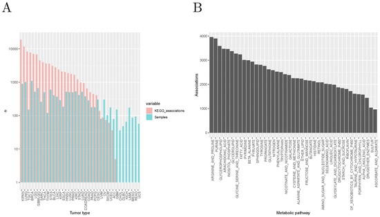 (A) Number of samples and of significant associations with molecular and clinical features by tumor type. (B) Number of significant associations by KEGG metabolic pathway.