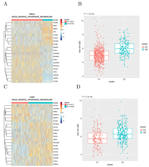 (A) Clustering of breast cancer samples using the genes associated to inositol phosphate metabolism according to KEGG. (B) Expression of miR-222 in the two clusters. (C,D) Same for lung adenocarcinoma samples.