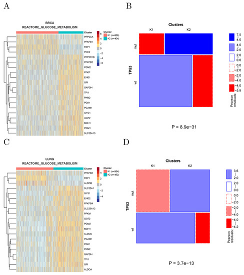(A) Clustering of breast cancer samples using the genes associated with glucose metabolism according to REACTOME. Cluster K2 shows upregulation of Warburg effect genes, such as GAPDH, PGK1, and PKM2. (B) The prevalence of TP53-mutated samples is significantly higher in cluster K2. (C,D) Same for lung cancer samples.