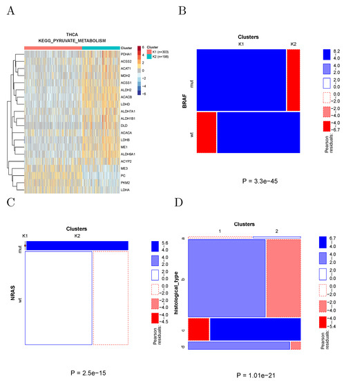 The clustering of thyroid cancer samples according to the genes associated with KEGG to pyruvate metabolism is shown in Figure 6A. These two clusters show many significant differences in both clinical and molecular parameters. In particular (Figure 6B,C), the prevalence of BRAF and NRAS-mutated samples was strikingly different in the two clusters, with all NRAS-mutated samples found in Cluster 2, and the large majority of BRAF-mutated samples found in Cluster 1. The two clusters also strongly differed in the respective prevalence of histological types.