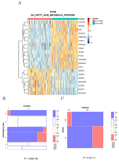 Clustering of thymoma samples using the genes associated with fatty acid metabolism divides the samples into two clusters (Figure 7A) largely overlapping the known histological types (Figure 7B) and differing in the prevalence of a recurrent GTF2I mutation [14].