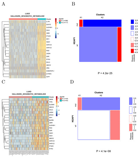 (A) Clustering of lung adenocarcinoma samples using the genes in the xenobiotic metabolism hallmark gene set. (B) Mutations of KEAP1 are strongly enriched in the K2 cluster where the pathway appears to be activated. (C) Clustering of lung adenocarcinoma cell lines using the same gene set. (D) Also in cell lines mutations are enriched in the cluster showing pathway activation.