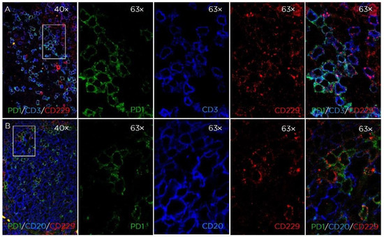 Expression of CD229 in tonsil GC. Triple color immunofluorescence of tonsil GC. (A) PD1 (green), CD3 (blue), and CD229 (red); (B) PD1 (green), CD20 (blue), and CD229 (red) (magnification: 40× and 63×).