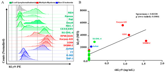 We studied the expression levels of CD229 of several B-cell lymphoma and myeloma cell lines using flow cytometry. Consistent with the data shown above, the myeloma cell lines were the ones that presented the highest expression levels (Figure 6A). We tested the capacity of these cell lines to secrete sCD229, after 48 h of culturing them without any stimuli, using an ELISA. We observed a correlation of CD229 expression intensity on leukocyte cell lines and the levels of sCD229 present in their supernatants (Figure 6B).