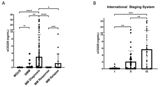 Serum sCD229 levels in patients with MM. (A) sCD229 levels in serum samples from 54 patients with MGUS, 23 patients with SMM, 122 patients with newly diagnosed MM, 39 patients achieving response, and 18 patients after myeloma relapse. (B) sCD229 levels in serum samples from 122 patients with NDMM according to the International Staging System (ISS). ns, non-significant; * p < 0.05; ** p < 0.01; *** p < 0.001; **** p < 0.0001.