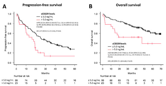 Frequency and percentage were used for categorical variables while median and range were used for continuous variables. Differences between groups were compared using Fisher’s exact test or c2 test for categorical variables, as well as the t-test or Wilcoxon test for continuous variables. Spearman’s rho correlation coefficient was used to compare continuous variables. The starting point for time-to-event analysis was the date of diagnosis. Prognosis was determined by analyzing PFS and OS. The starting point for both was first line treatment initiation. The probability of PFS and OS was calculated with the Kaplan–Meier method and survival curves were compared using the log-rank test. The Cochran–Mantel–Haenszel statistic was performed to stratify data and adjust for confounding variables. Multivariate Cox regression models were performed using the backward stepwise method to identify factors independently associated with PFS and OS. The method of maximally selected rank statistics (maxstat and survmine packages, R software) was used to calculate the best sCD229 cut-off to predict PFS and OS, and a value of 5.0 ng/mL was obtained (Figure S3). P values were two-sided and p < 0.05 indicated statistical significance. All analyses were performed using R.3.6.1 (R Foundation for Statistical Computing, Vienna, Austria) and GraphPad Prism version 8.0.2.