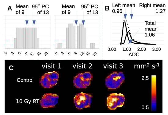 (A) Example of two data distributions (arbitrary units) that have the same mean, 95th percentile and integral, but are clearly different from one another. (B) Histogram of ADC data from a tumor treated with RT (dotted distribution) decomposed into treatment effect (left distribution) and no-effect components (right distribution). (C) ADC maps of control and RT treated Calu6 tumors have distinct habitats with different tumor microenvironments.