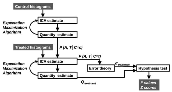 Control histograms are deconstructed giving components describing untreated behaviour. Histograms are added to create additional components to describe treated behaviour. All components are combined with Bayes Theorem to give per bin, per time point (A, T) probabilities of classification (C = c control or C = t treatment). The error theory is used to produce hypothesis tests for the significance of treatment effects.