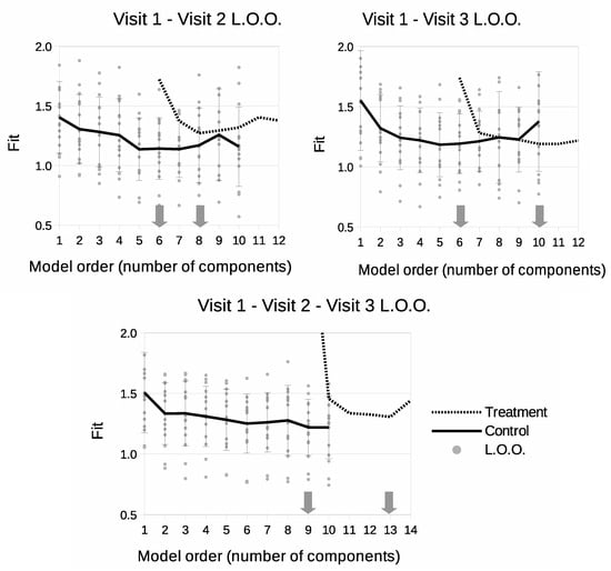 Model selection curves can be seen in Figure 3. For V1–V2 and V1–V3 models, the control parts have the same level of complexity and required 6 components to create a sufficient description of the data. Regarding the treatment part, the use of Visit 3 data in both V1–V3 and V1–V2–V3 models increases the required model order, suggesting that there is more information (variability) within the third scan than there is in the second. The most complex model was the V1–V2–V3 version, requiring 9 components for the control part and 13 for the complete model.