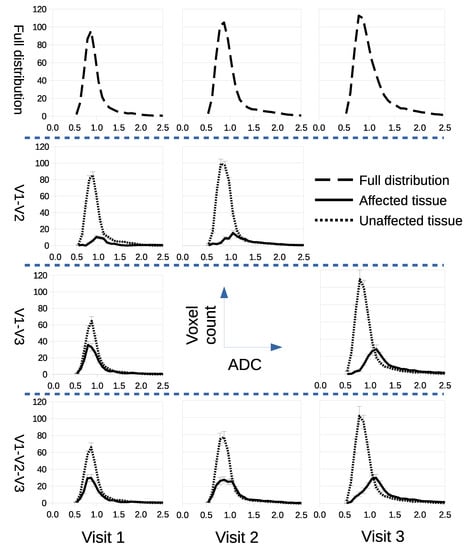 LPM decomposes ADC distributions into treatment-affected parts and parts that have no measurable differences from control distributions (unaffected). Rows from top to bottom show the full ADC distributions before decomposition, followed by alternative decomposition models for scan combinations V1–V2, V1–V3, and V1–V2–V3.