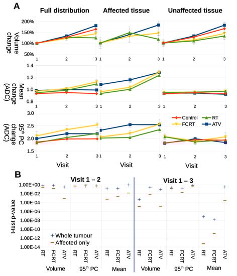 (A) Parameters computed using full ADC distributions or sub-distributions as decomposed via LPM. Each curve shows the average behaviour of a different parameter (volume, mean and 95th percentile), as computed from each respective cohort: control, RT, FCRT and ATV. (B) p-values achieved via t-tests comparing control to treatments using basic parameters between different time points. From left to right, the columns show parameters for the full distribution (a standard analysis of ADC), from affected regions, and for unaffected regions.