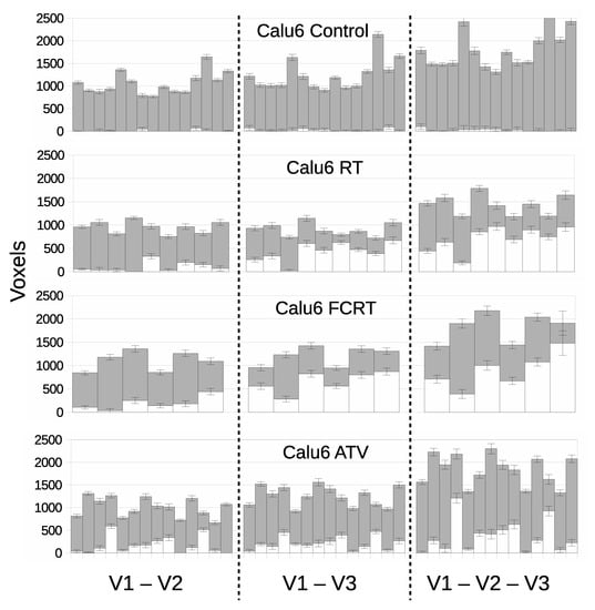 We evaluated if LPM could distinguish biological response rates across different therapies all examined in the Calu6 model. Figure 6 shows ‘affected’ volumes consistent with biological response for control tumors and those receiving RT, FCRT and ATV. Data are presented for V1–V2, V1–V3 and V1–V2–V3 scan combinations. All control data had ‘treated’ volumes consistent with noise limits.