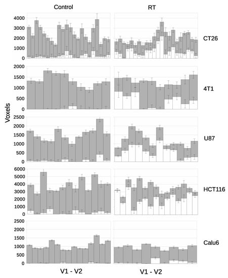 Figure 7 shows ‘affected’ volumes consistent with biological response for control tumors and those receiving RT for V1–V2 only. Z scores and p-values for each tumor are listed in the suplimentary material. Control data had ‘treated’ volumes consistent with noise limits for 71/72 tumors across the five cohorts of control tumors. Just 1/72 individual tumor had Z score >3.0 which was CT26 with Z score of 4.34.