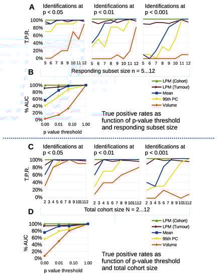 Figure 8A shows TPR as a function of n for common significance levels. We considered scenarios with cohort sizes and varied the subset of tumors that had biological response, n, starting with less than half responding. We calculated TPR for t-test changes in volume, mean, 95th percentile and LPM responding volumes on tumor and cohort level. At the 0.05 level, change in volume showed the worst TPR, with up to 20% detection when n/N was 9/12 or less. LPM on individual tumors outperformed change in 95th percentile and was comparable to mean changes across the entire cohort. LPM across cohort acheived very high TPR, detecting 10 out of 10 simulated cohorts. As the threshold increased TPR declined substantially for t-tests, whereas the LPM for individual tumors had minimal reduction in TPR and across cohort retained a very high TPR. Figure 8B shows the area under the TPR curve (AUC) as a function of p value thresholds. LPM TPRs were relatively independent of the proportion of biological responders in a cohort.