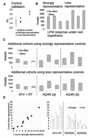 Validation and conformity checking of additional control tumors. (A) LPM goodness-of-fit ( per d.f.) of additional control distributions compared against original controls (grey discs). The ‘strongly representative’ controls are the triangular points and the ‘less representative’ controls are the crosses. (B) Validation that when re-trained using additional controls, the LPM models show that both groups are consistent with there being no treatment effects. LPM analysis of additional treatment cohorts. (C) Volumetric assessment of tumor changes in response to the additional treatments with different control models (ATV with RT, AQ4N(a) with single dose of 60 mg/kg, AQ4N(b) 3 doses of 20 mg/kg daily). (D) Statistical significance, in terms of Z-scores, of treatment effects compared across both control groups models.