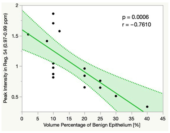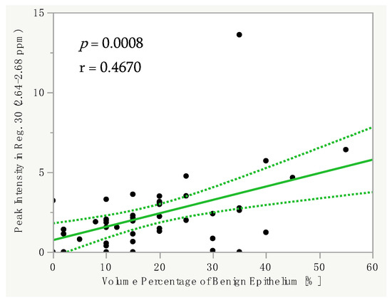 The volume percentage of benign epithelium correlated significantly with the spectral peak intensities in several regions. For example, we found a significant positive linear correlation between the Vol.%Epi and the spectral peak intensity in Reg. 30 (2.64–2.68 ppm; p = 0.0008, r = 0.4670) in all groups (Figure 3). Typically, the signal of citrate largely contributes to the peak intensity in this region. Moreover, there was a significant positive linear correlation between the Vol.%Epi and the spectral peak intensity in Reg. 23 (3.05–3.08 ppm; p = 0.0399, r = 0.2976), which usually represents the signal of polyamines.