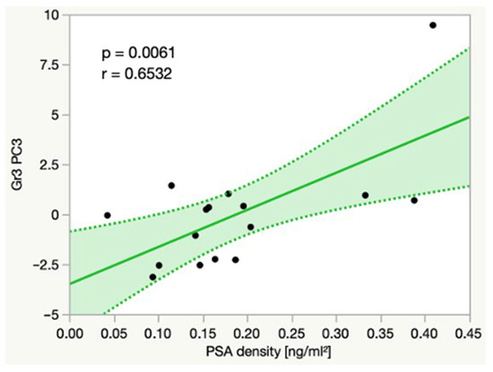 Additionally, we were able to show significant linear correlations between the PSA density and multiple principal components, as well as the peak intensities of several spectral regions. For example, in Gr3, there was a significant positive linear correlation between the PSA density and Reg. 53 (1.00–1.06 ppm, p = 0.0047, r = 0.6682), which typically contains the signal of valine. In Gr3, the PSA density also significantly correlated with a principal component named PC3 (p = 0.0061, r = 0.6532) (Figure 5).