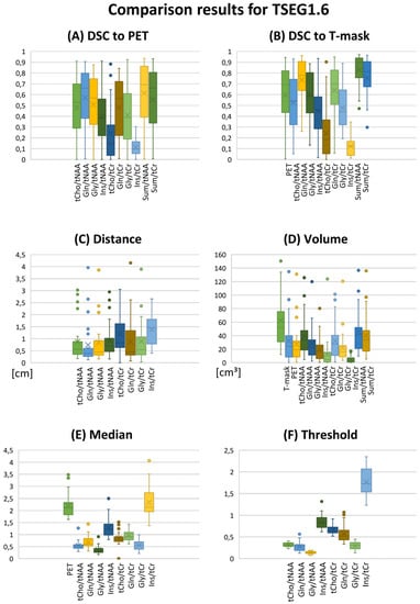 Overview of evaluation results as boxplots for the TSEG1.6 VOI definition. (A,B) DSCs for the comparison of MRSI ratios to PET and the T-segmentation. (C) CoI distance and (D) VOI volume. (E) Median ratios and (F) the calculated VOI thresholds. Gln/tNAA ratios show the best correspondence to PET. Key to the plot: Cross, mean; line, median; box, 2nd–3rd quartiles; whiskers, 1st and 4th quartiles.