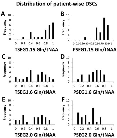 Our evaluation could be performed in 24 patients with sufficient MRSI quality. Example spectra are available in Supplementary Figure S3. While this report focuses on the overall cohort results (e.g., boxplots for TSEG1.6 in Figure 1), detailed patient-level data are available in the supplementary material as Tables S3–S8. Overall, a threshold of 1.15 proved to be unspecific for VOI definition, as expected from previous literature. This is demonstrated in histograms of the DSCs for Gln/tNAA for all six VOIs in Figure 2.