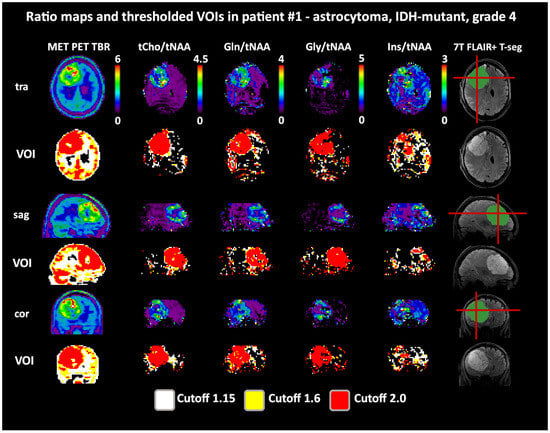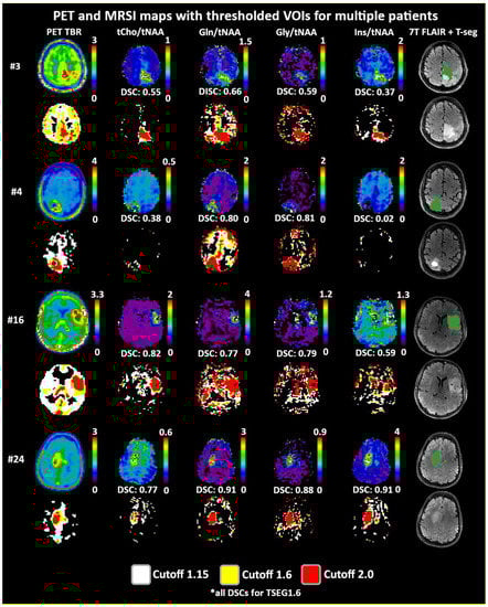 - Mauler, J.; Maudsley, A.A.; Langen, K.-J.; Nikoubashman, O.; Stoffels, G.; Sheriff, S.; Lohmann, P.; Filss, C.; Galldiks, N.; Kops, E.R.; et al. Spatial Relationship of Glioma Volume Derived from 18F-FET PET and Volumetric MR Spectroscopy Imaging: A Hybrid PET/MRI Study. J. Nucl. Med. 2018, 59, 603–609. [Google Scholar] [CrossRef] [Green Version]