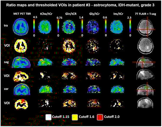 For the definition of VOI cutoff thresholds both for PET and MRSI necessary for quantitative evaluation, we used previous PET/MRSI studies as guidelines and to maximize comparability to our study. These studies used TBR cutoffs ranging from 1.15 for an unspecific uptake increase [26] up to 1.5/1.6 for pathological changes [19,26,29], or even 2.0 for hot lesions [28,43], while current standards for pathological uptake would be TBRs of >1.6 for FET and >1.3 for MET [44]. MRSI values in comparison studies were considered only within previously defined PET VOIs [27,28] or cutoffs defined as 2.0 times the mean value of tCho/tNAA in an NAWM control region [29,45]. Based on this, we arrived at three cutoff values applied both to the lower bound of values for MRSI and PET, namely, 1.15 for an unspecific metabolic increase, 1.6 for a clear oncometabolic change, and 2.0 for the activity core. In our NAWM segmentation, we calculated median values for all used metabolite ratios to calculate these cutoffs. While TBR calculation used mean values, we used medians for MRSI ratios as this is more robust to outliers. All three cutoffs were applied, respectively to all TBR and MRSI ratios, within the T-segmentation resulting in the VOIs “TSEG1.15”, ”TSEG1.6”, ”TSEG2.0”, and within the P-segmentation resulting in the VOIs “PSEG1.15”, ”PSEG1.6” and ”PSEG2.0”.