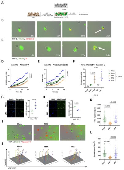 The first objective of the study was to investigate the ability of monocytes to induce tumor cell death by direct cell-to-cell contact. We used a well-characterized model based on THP-1 monocytic cell line. As control, THP-1 cells were differentiated with PMA (16.2 µM) during 48 h [29,30]. In order to make distinction between tumor cells and monocytes, M14K were labeled with CFSE and then cocultured with untreated (Mock) or PMA-differentiated THP-1 according to the protocol schematized in Figure 1A. The cocultures of M14K and mock THP-1 were recorded hourly by time-lapse Incucyte imaging, in the presence of annexin V-APC (Figure 1B and Supplementary Video S1) or propidium iodide (Figure 1C and Supplementary Video S2). Annexin V labels early apoptosis while propidium iodide reveals irreversible cell death through plasma membrane permeabilization [32]. Both fluorescent markers labeled CFSE+ M14K in contact with mock THP-1 monocytes, indicating onset of cell death. More importantly, the videos clearly illustrate that apoptosis occurred after a transient contact between M14K and THP-1 cells. The percentages of annexin V+ CFSE+ and PI+ CFSE+ double-positive M14K cells gradually increased with time (Figure 1D,E, respectively). Although cytotoxic interactions between M14K cells and mock THP-1 occurred, there was no statistically significant difference between the percentages of apoptotic M14K cells in the different conditions: absence of monocytes (mock, in black), presence of THP-1 (mock THP-1, in green) or PMA-differentiated THP-1 (PMA, in orange). A series of pharmacological inhibitors of tyrosine kinases and histone modulators was, therefore, evaluated at different doses and cell ratios to modulate the cytotoxicity of THP-1 monocytes (data not shown). Among these, valproate (VPA), a HDAC inhibitor previously evaluated in a clinical trial, significantly increased THP-1-mediated cytotoxicity towards M14K cells (in blue, Figure 1D,E and Supplementary Figure S1) [33]. In contrast, an inhibitor of the EZH2 histone methyltransferase of the Polycomb repressive complex 2 (EPZ) had no statistically significant effect in eight independent experiments (EPZ, in grey, D,E and Supplementary Figure S1). These conclusions were validated by flow cytometry analysis performed after 48 h of coculture (Figure 1F). Note that flow cytometry revealed an effect of PMA that was not observed by Incucyte imaging. This apparent discrepancy was related to the experimental conditions. Incucyte imaging and flow cytometry were performed at different cell THP-1/M14K ratios (1/1 and 10/1, respectively). High cell ratios were not compatible with Incucyte time-lapse imaging due to the resulting fluorescence saturation that led to misrepresentation of the number of events. In flow cytometry, high cell ratios were required to analyze significant numbers of events. The experiments were extended to another cell line of the non-epithelioid subtype (ZL34, annexin V, Supplementary Figures S2 and S3). Epifluorescence microscopy confirmed the inhibitory effects of VPA and EPZ on lysine deacetylation and H3K27 trimethylation, respectively (Figure 1G,H). Time-lapse imaging further revealed that PMA and VPA promoted externalization of phosphatidylserine on THP-1 monocytes as indicated by their red fluorescence in the presence of annexin V-APC (Figure 1I). Notwithstanding, the phenotype of THP-1 differentiated with PMA or VPA markedly differed in terms of cell shape, motility, and membrane receptor. While PMA increased the cell size and granularity (Figure 1I and Supplementary Figure S4) and reduced migration indicating monocyte-to-macrophage differentiation, VPA had no significant effect on THP-1 motility (Figure 1J–L). Moreover, VPA-treated THP-1 present a significantly higher expression of CD14 membrane receptor compared to mock and PMA-treated THP-1 (Supplementary Figure S5).
