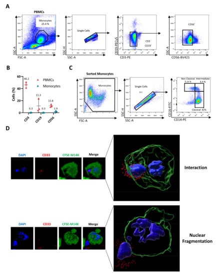Cell-to-cell contact between blood-derived monocytes and M14K cells. (A) PBMCs were isolated from buffy coats of healthy donors by Ficoll gradient centrifugation. After labeling with CD3-PE, CD19-PECy5, and CD56-BV421 antibodies, monocytes were negatively sorted by flow cytometry. (B) Flow cytometry analysis of PBMCs and sorted monocytes labeled with CD3-PE, CD19-PECy5, and CD56-BV421 antibodies. The graph represents the percentages of labeled events before (PBMCs) and after cell sorting (Sorted Monocytes). (C) Isolated monocytes were labeled with anti-CD14-PE and anti-CD16-FITC. Representative plots are shown. (D) M14K cells were labeled with CFSE, incubated for 4 h, and then cocultured with freshly isolated monocytes at a ratio of 4/1. After 24 h of culture on coverslips, cells were labeled with an anti-CD33 primary antibody followed by an Alexa Fluor 647 conjugate. Cells were further fixed with PFA 4%, stained with DAPI, and analyzed with a HR confocal microscope. Images were computed with Imaris. Representative interactions between CFSE-positive M14K cells (in green) and CD33-labeled monocytes (in red) are shown. Nuclei fragmentation is revealed by DAPI staining (in blue).