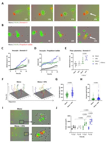 To further quantify their cytotoxic activity, primary monocytes (Mock) were cocultured with CFSE-labeled M14K cells and recorded by time-lapse imaging. Both annexin V-APC (Figure 3A and Supplementary Video S5) and PI (Figure 3B and Supplementary Video S6) fluorescent markers confirmed that primary monocytes (Mock) induce M14K cell death after a transient contact. Quantification of the Incucyte data set showed that primary monocytes were cytotoxic for M14K cells particularly in the presence of a sub-toxic dose of VPA (2 mM) (Figure 3C,D and Supplementary Figure S6). These conclusions were validated by flow cytometry analysis performed at 24 h of coculture (Figure 3E) and at different monocyte-M14K ratios (Supplementary Figure S7). Computing Incucyte images with the CellTracker software unveiled that VPA increased the total migration and average speed of monocytes (Figure 3F–H). Another marked effect of VPA is the induction of clusters between monocytes and M14K cells (Figure 3I). Cellular aggregation was quantified from Incucyte data by measuring the cluster area formed by M14K cells with one or several monocytes. Time course kinetics revealed that cluster area increased with time in the presence of monocytes (in green) particularly when the coculture was incubated with VPA (in blue) (Figure 3J).