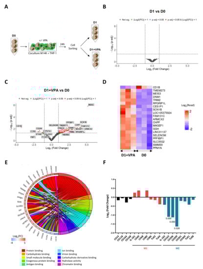 In order to get a deeper insight into the mechanisms promoted by VPA, the transcriptomic profiles of cocultured monocytes were established by RNA sequencing. For this purpose, monocytes were sorted by flow cytometry after being cocultured with M14K cells (Figure 4A). RNAs were extracted from monocytes prior (D0) and after 24 h of coculture, in the absence (D1) or in presence of VPA (D1 + VPA). Complementary DNA (cDNA) libraries were amplified and sequenced with a Novaseq 6000 device. After adequate quality controls, reads were stripped of adaptors and aligned against the human reference genome. Read counts were calculated from the alignment data and differential gene expression analysis (DGEA) between experimental conditions was performed (Supplementary Tables S1–S3). As indicated by the volcano plot of Figure 4B, there was no significant differentially expressed gene (DEG) at p-adj < 0.05 that was associated with the coculture (D1 vs. D0). In other terms, the short-term culture of monocytes in contact with tumor cells only marginally affected their transcriptome. In contrast, VPA modified the transcriptome of monocytes (Figure 4C), consistently with the ability of this HDAC inhibitor to induce gene expression [35,36]. The heatmap of Figure 4D further showed the top list of DEGs affected by VPA during the coculture. Gene ontology classification and pathway enrichment analysis highlighted that protein binding (GO:0005515), carbohydrate binding (GO:0030246), small molecule binding (GO:0036094), exogenous protein binding (GO:0140272), antigen binding (GO:0003823), ion binding (GO:0043167), virion binding (GO:0046790), carbohydrate derivative binding (GO:0097367), hydrolase activity (GO:0016740), and chromatin binding (GO:0003682) predominantly characterized the effect of VPA (Figure 4E and Supplementary Table S4). Concomitantly, membrane receptors associated with the M2 phenotype were also statistically significantly downregulated in conditions D1 + VPA compared to D0: CD163 (Log2(Fold Change) −1.09; p-adj 0.05), CD206 (Log2(Fold Change) −1.13; p-adj 0.05), and CD209 (Log2(Fold Change) −1.64; p-adj 0.03) (Figure 4F).