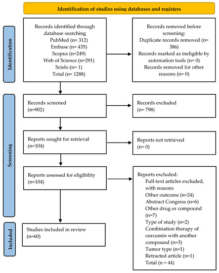 The inclusion criteria were as follows: (1) in vitro and animal experimental model investigations on the effects of curcumin on human and animal breast cancer cells of different lineages, (2) peer-reviewed original research articles, (3) no language restrictions, and (4) no publication year restriction. The exclusion criteria were as follows: (1) doctoral and master’s theses, (2) case studies, (3) editorials, (4) letters to editor, (5) duplicate studies found in more than one database and in silico studies, (6) epidemiological studies, (7) clinical assays and articles that requested permission from authors without response, (8) studies irrelevant to the antitumor effect of curcumin on breast cancer, (9) trials performed in non-oncological clinical conditions, (10) studies involving a sole treatment protocol based on the association between curcumin and other treatment modalities, and (11) trials involving immunodeficient animal models.