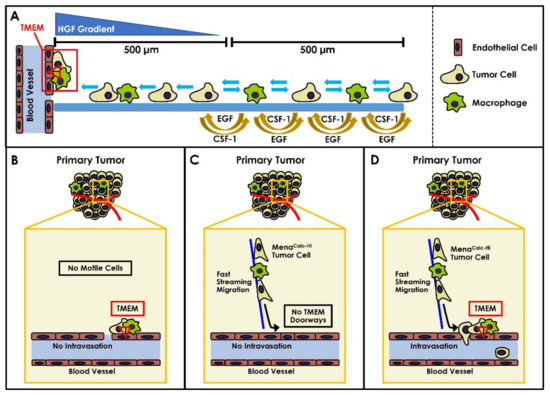 To identify those cancer cells within the tumor that are capable of intravasation, we developed the in vivo invasion assay, a technique capable of isolating the motile fraction of cancer cells from the rest of the immobile bulk of the primary tumor [11,12,13]. Using this assay in mouse models of breast cancer, we were able to determine that a subset of tumor cells and macrophages communicate with each other via a paracrine loop that enables them to co-migrate together along collagen fibers at 10–100 times the speed of the rest of the tumor cells within the bulk tumor. This type of coordinated cellular motion is known as “fast streaming migration” [13]. We further determined that endothelial-cell-secreted Hepatocyte Growth Factor (HGF) gradients provide a directional chemoattractant signal which attracts fast-migrating cells that are less than 500 µm away from blood vessels [14] (Figure 1A). Expression profiling of these cells showed that Mena, a key actin polymerization regulatory protein, plays an important role in potentiating tumor cell motility as well as tumor cell intravasation near TMEM doorways [15,16,17].
